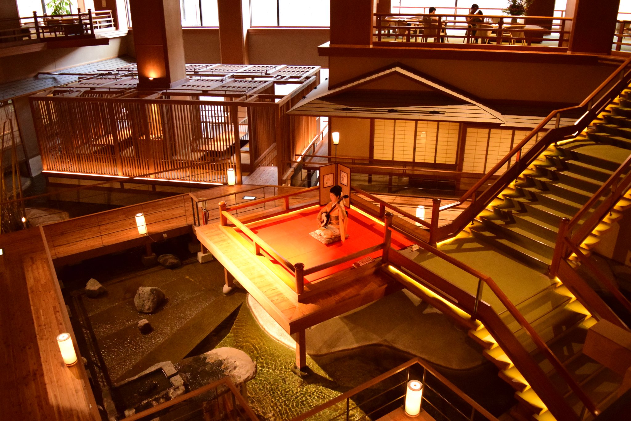 正面玄関を入ると吹き抜けのロビーの中央にある赤い床の舞台で地元の民謡歌手・佐藤恵美子さんが毎日、夕方に三味線を弾き、宿泊客を出迎えてくれます。